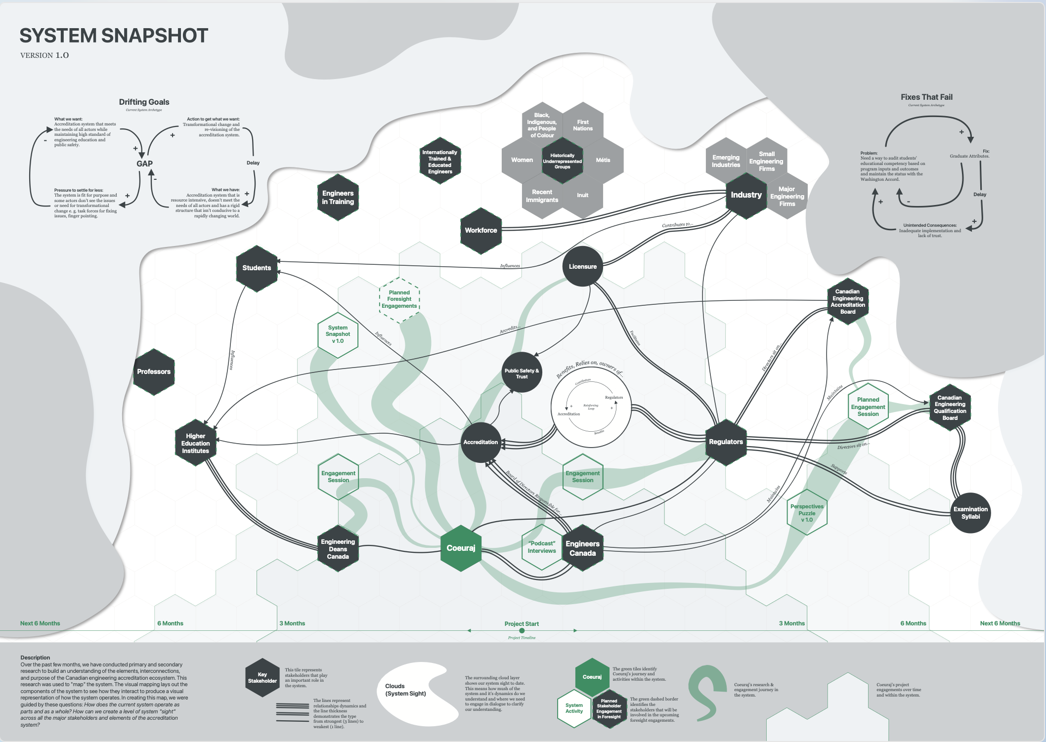 How might we apply and scale our community-centred research methods to engage hundreds of stakeholders across Canada’s engineering ecosystem to make visible the invisible dynamics of the current national accreditation system?