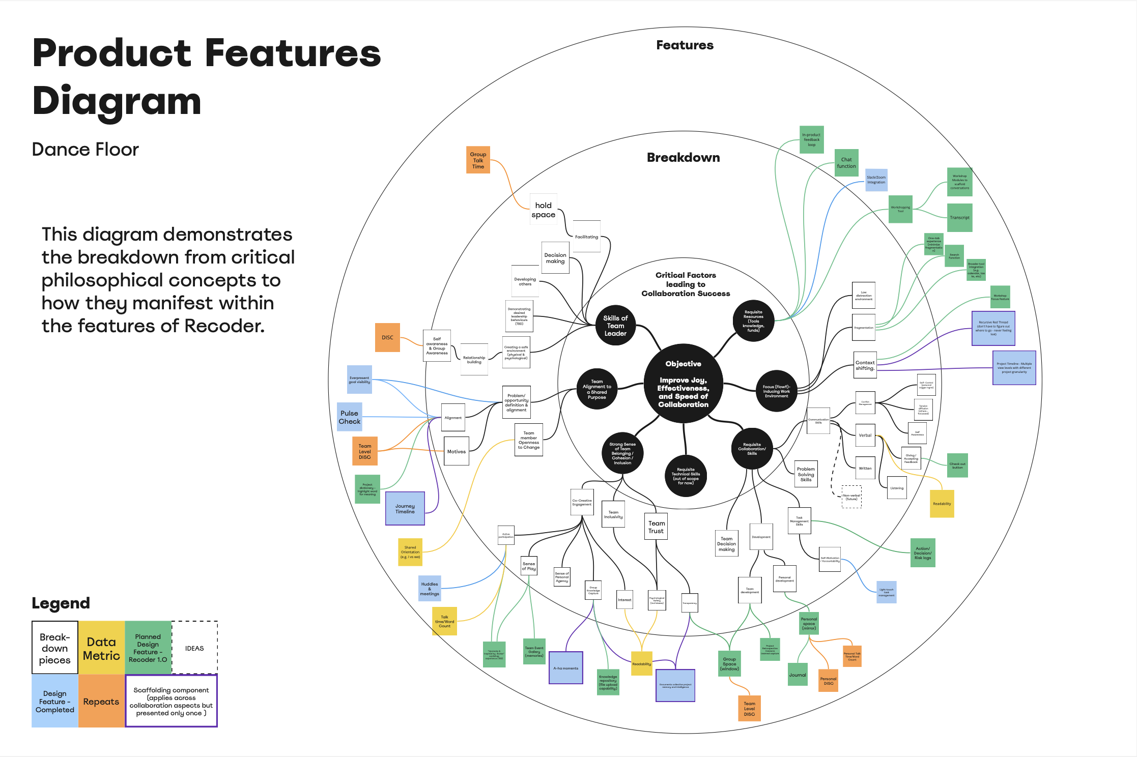 To capture our experience, I made a journey map to help clarify the service journey for our practice team. Then, with my tech and data science team, we worked to narrow down the features in a workshop where I created a product features diagram to help link key service moments with tangible product features.