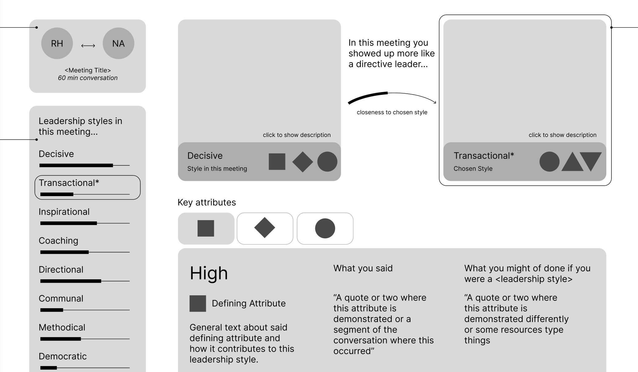 After testing the MVP with users and real data, I began to better understand how to create a user interface that would lead to actionable, bite-sized information that our users could use to grow their leadership styles. I looked to sports related apps such as Strava, Nike run club, Garmin for inspiration because I began to see each meeting with your direct report almost like a workout in your particular leadership style. Therefore, the UI could take inspiration from these performance based apps to have a parallel performance based experience but for leadership. This manifested itself in the 5 past meeting cards that would indicate a high level overview of your recent “workout”, changing to green when you succeeded at displaying your goal leadership style. I worked closely with our data scientist to refine the user experience to be inline with the science behind each feature so as to not misrepresent the findings.